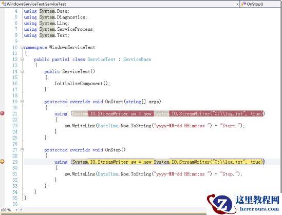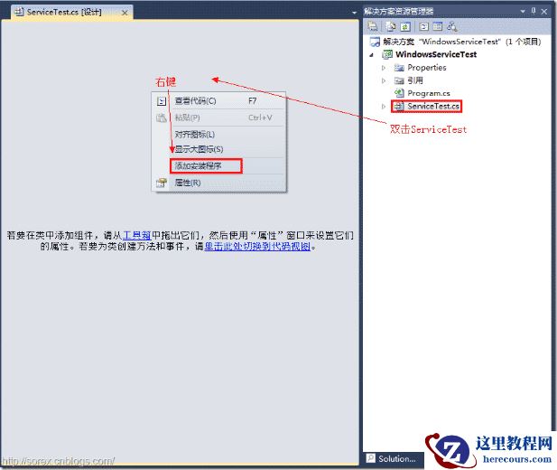 将Service1重命名为你服务名称,这里我们命名为ServiceTest。