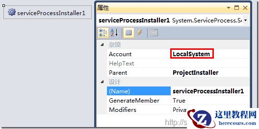 右键serviceProcessInsraller1,选择属性,将Account的值改为LocalSystem。