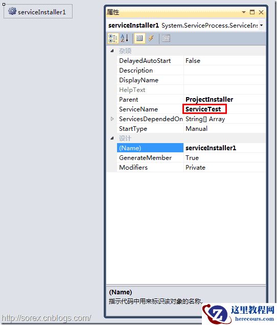 右键serviceInsraller1,选择属性,将ServiceName的值改为ServiceTest。