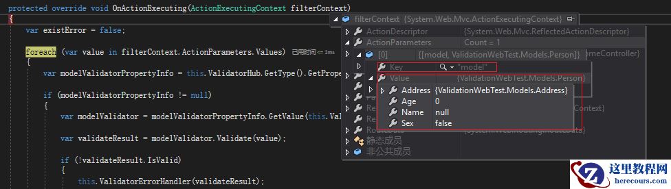 在 OnActionExecuting 里,我们首先定义了一个existError,用来判断是否验证失败的,然后我们遍历了 filterContext.ActionParameters.Values