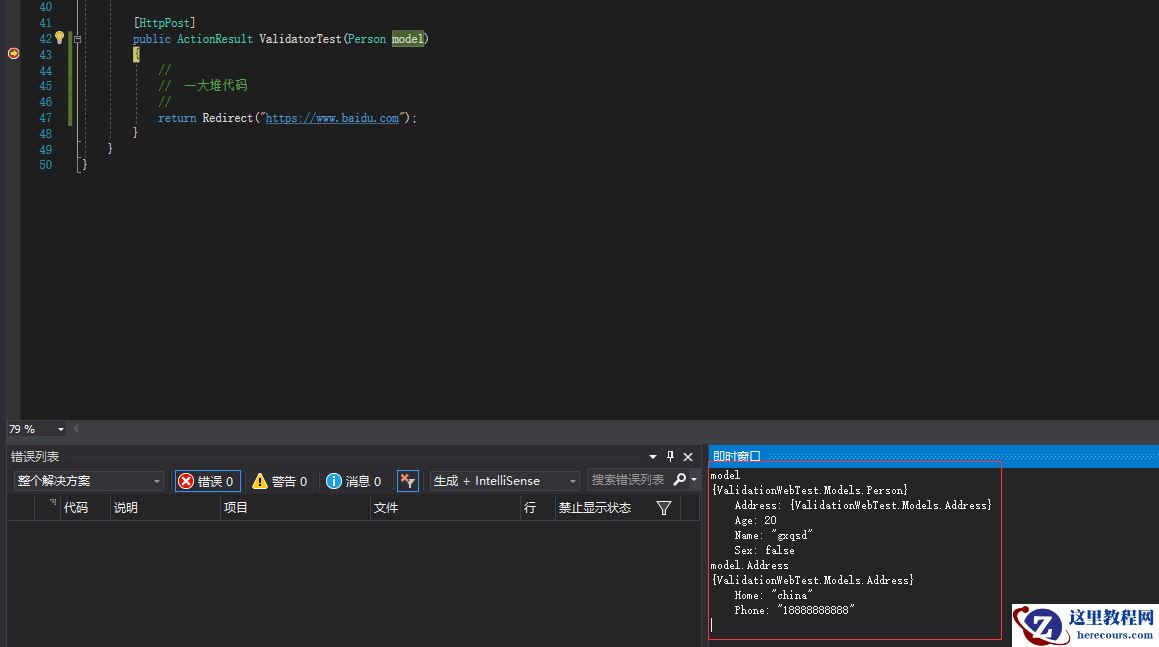 现在我就可以在这里进行验证了,我们知道value 就是那个model 所以直接对他进行验证,验证会返回一个ValidationResult类型接下来的事我就不解释了,相信上一章已经讲得很清楚了。最后根据是否存在错误在进行提前处理,如果有错误的话就直接返回视图呈现错误了,连咱们的Action都不执行了。好了,到这里咱们昨天讲得OnActionExecuted 可以直接Delete拉 。