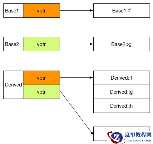 vptr=((& Derived::_ZTV7Derived) + 28u)如果看不明白这些乱七八糟的输出,没关系(当然能看懂更好),把上面的输出转换成图的形式就清楚了: