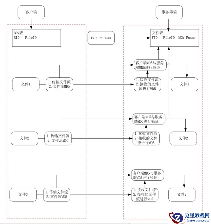 1.客户端上传file,转换成二进制流到服务器,服务器接收进行MD5加密,把文件及密码存入文件服务器库,文件根据MD5保存进本地文件夹,文件夹命名第一级取MD5前二位,第二级文件目录是MD5第3和4位,保存的文件重新命名,名称是当前加密的MD5。 当然,加密储存需要验证的,如果本地已经存了这个MD5就认为已经保存了相同的文件,就不需要再保存。