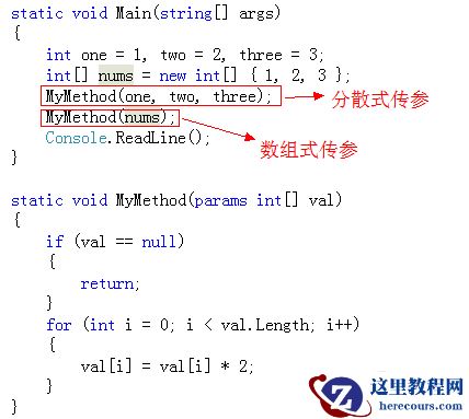 声明参数数组,必须要有params修饰符(调用不需要修饰符),必须是一种类型的数组。