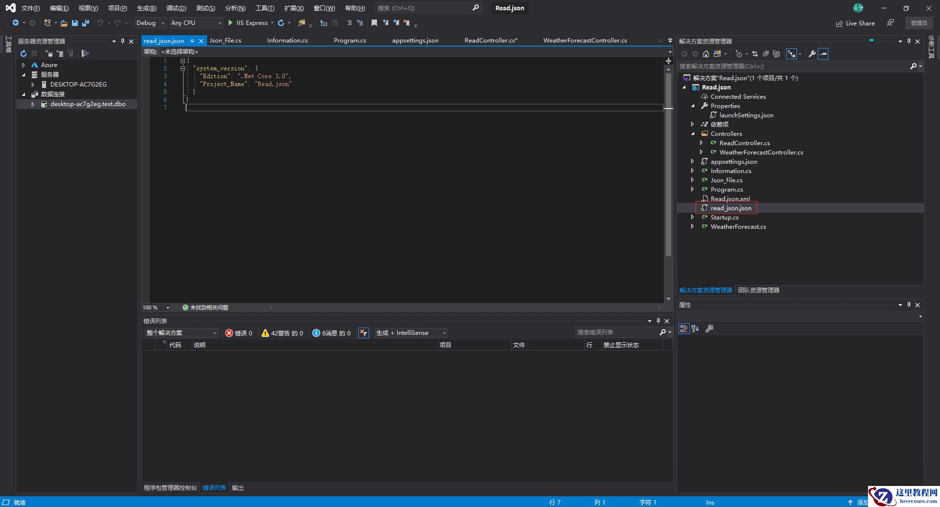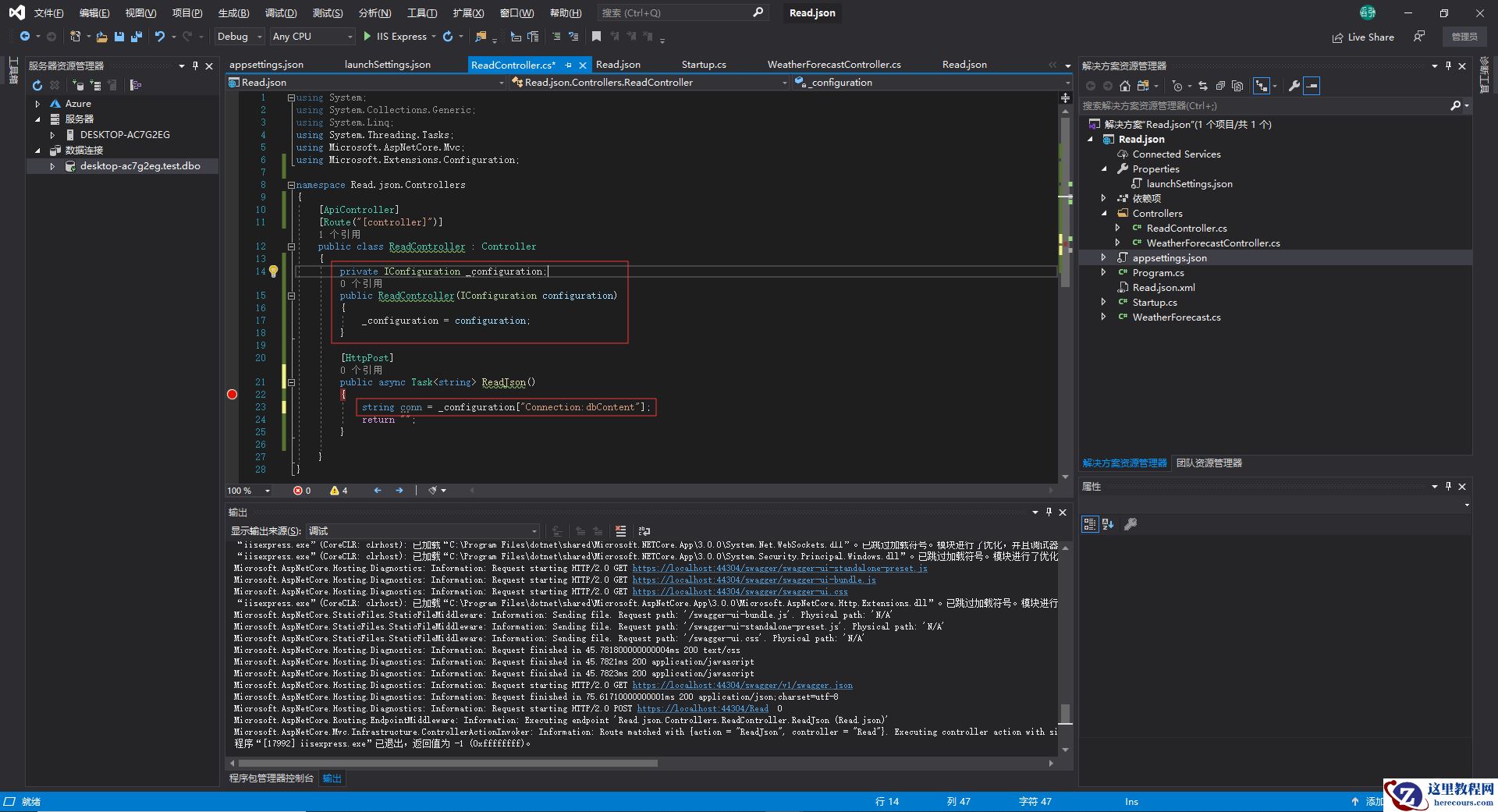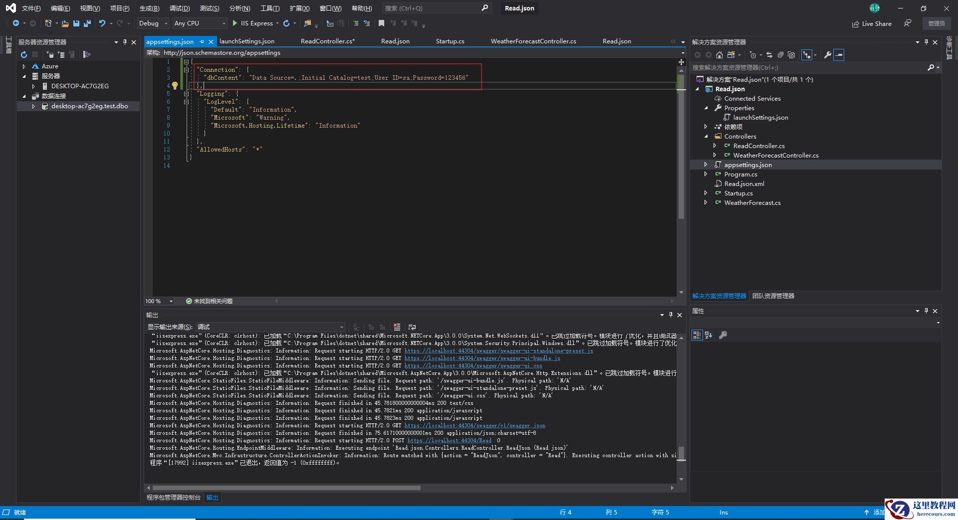 我们先在appsettings.json中配置好数据库连接字符串,然后读取它