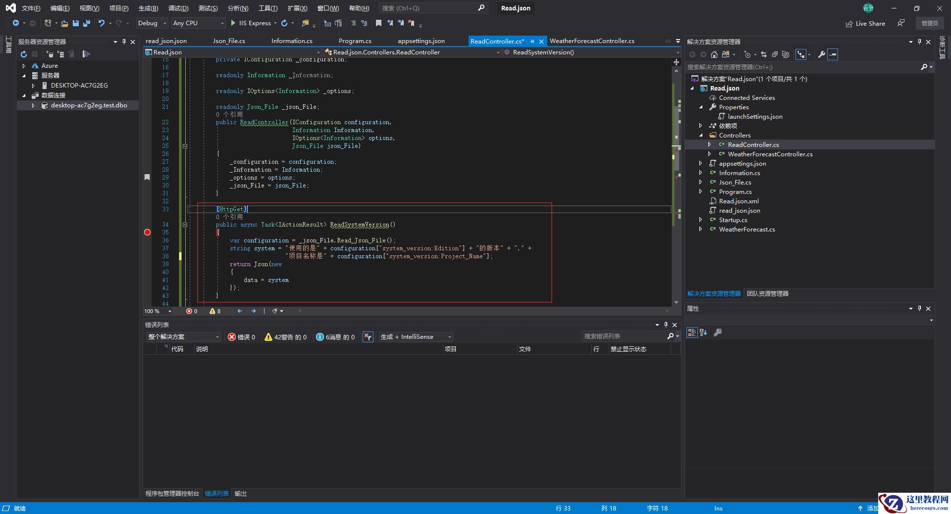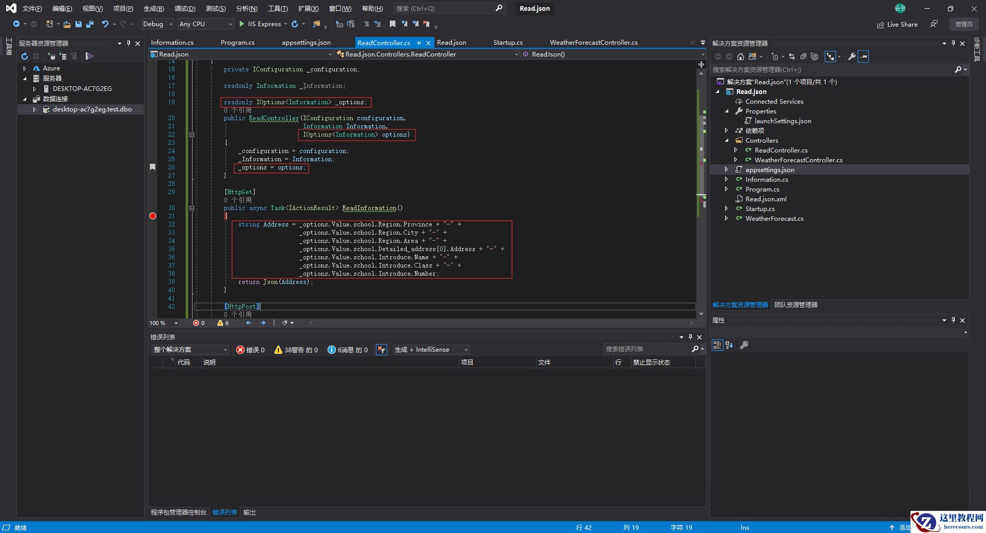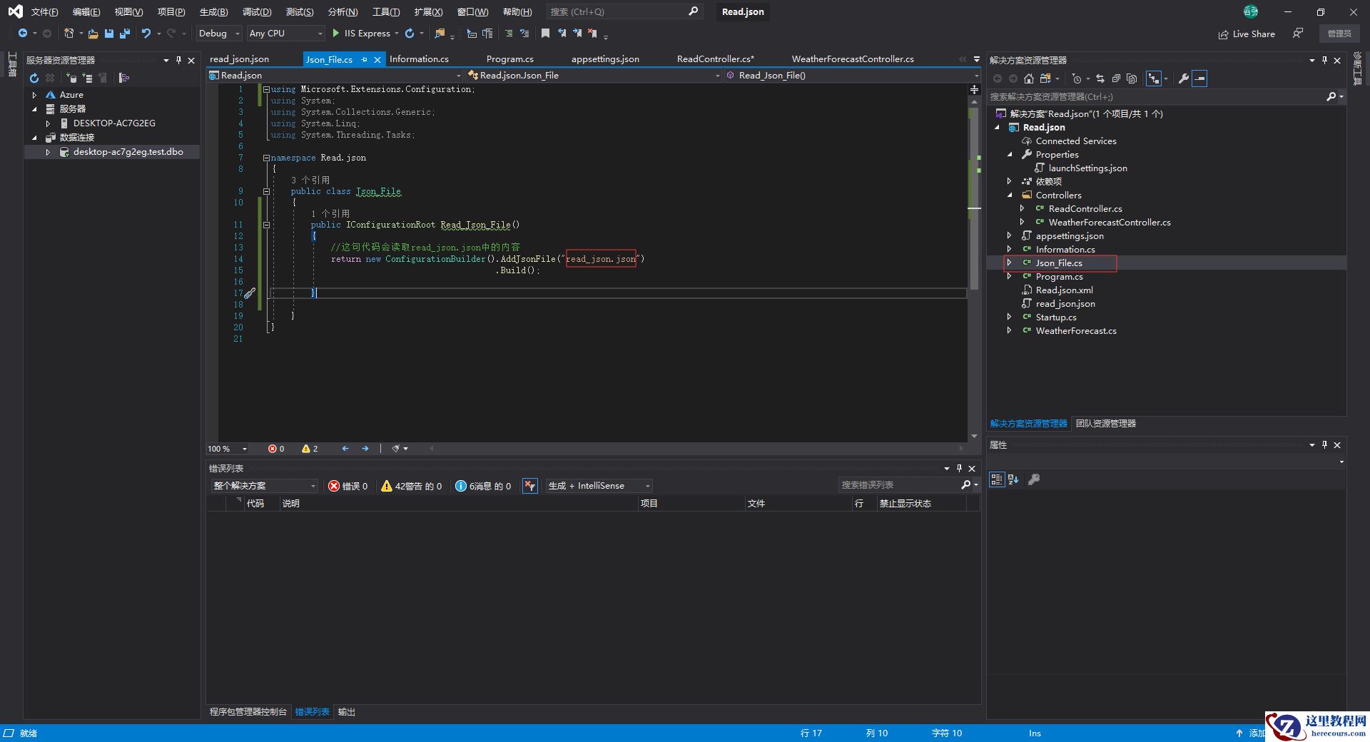 我们先在appsettings.json中配置好数据库连接字符串,然后读取它