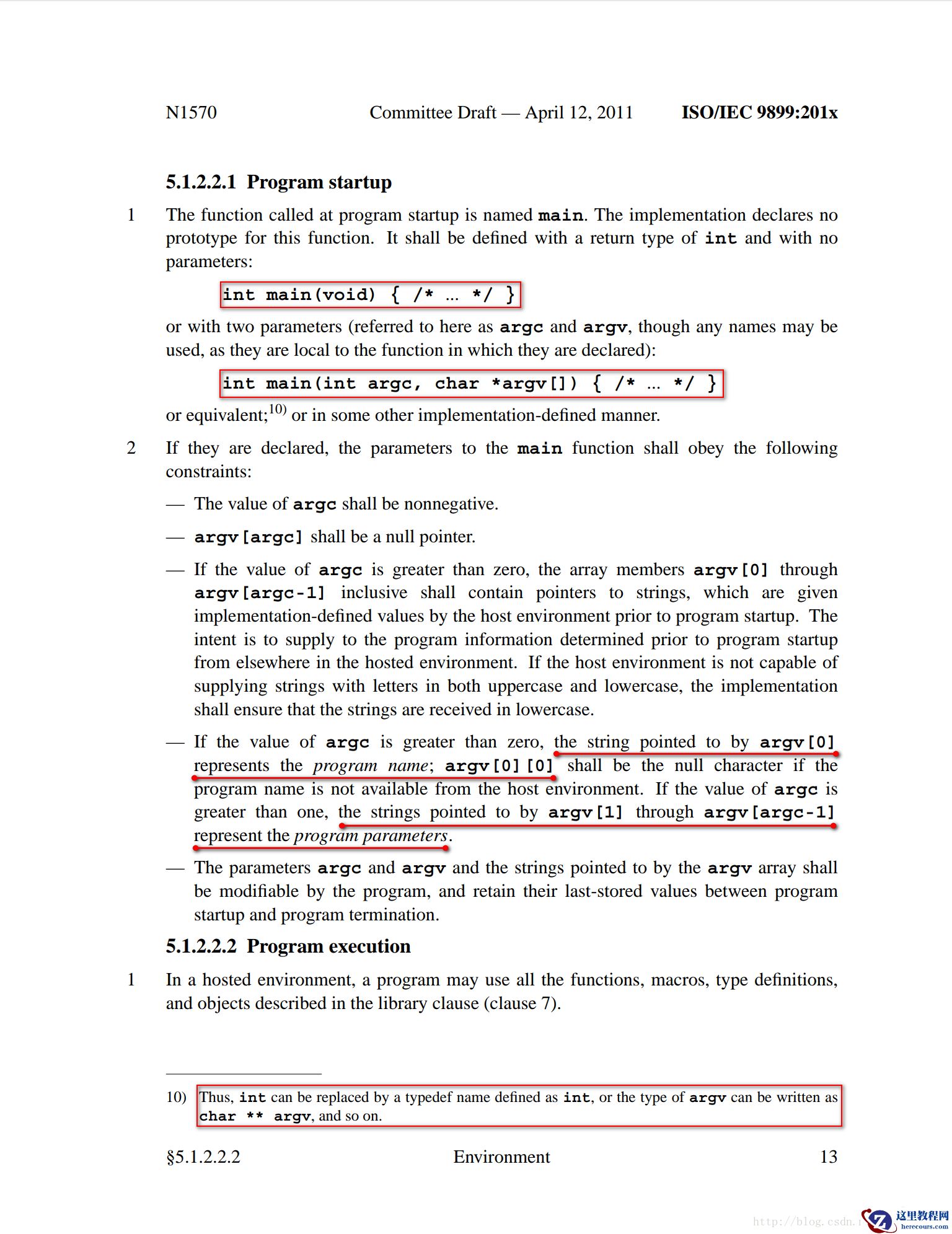 从上面的测试来看,写法1在C90标准下可以正常编译,而在C99和C11标准下会抛出一个警告(不写返回值,默认的返回值为int,也就相当于写法1和写法3等价)。写法2-6在C90、C99、C11标准下均能正常编译。在这么多写法中,到底哪一些才是main函数的标准写法?于是查阅了C标准文档对main函数的规范写法,见下图: