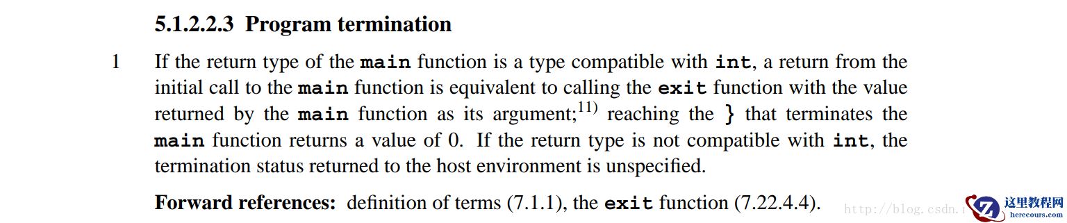 从标准文档中可以看出,写法4、5、6才是main函数的规范写法。写法5与写法6是等价的。那为什么又会有写法1、2、3呢?那是因为从1972年C语言被设计出来到C90标准发布这段时间,对C语言不同的实现就导致了对main函数的差异性。强烈不推荐写法2,因为main函数是被操作系统调用的,操作系统会根据main函数的返回值来判断程序的正确执行与否,如果返回void,那代表的是什么状态呢?而且一些编译器支持这种写法,一些编译器不支持,所有的标准并未认可这种写法。对于写法1和写法3还勉强能够接受,不过也不建议这样写,最好还是按照标准写法来写。为什么要按照标准写法来写?那是因为为了让C程序具有更好的移植性。写法5与写法6是等价的,第一个参数代表main函数参数的个数,第二个参数用指针分别指向这些参数。argv[0]代表程序名,argv[1]到argv[argc-1]代表程序参数。下面再看看main函数的返回值问题,见下图