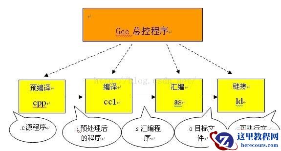 我们在linux使用的gcc编译器便是把以上的几个过程进行捆绑,使用户只使用一次命令就把编译工作完成,这的确方便了编译工作,但对于初学者了解编译过程就很不利了,下图便是gcc代理的编译过程: