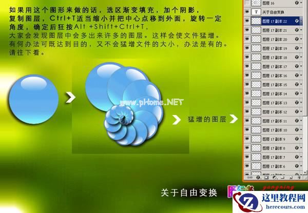 1.关于自由变换,大家都制作:编辑 > 自由变换,也可以用Ctrl + T,如果我们要制作的是有大到小的变换并复制,那么用这个快捷键:Alt + Shift + Ctrl + T 这个键大家常用,但也有一定的小技巧。