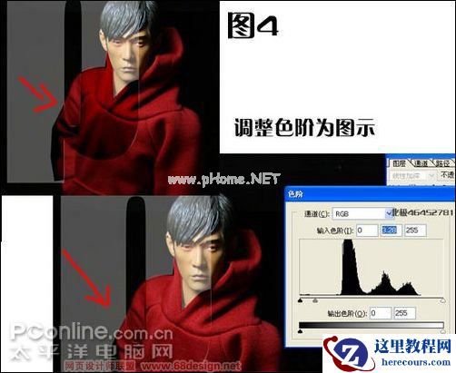 C:点击刚刚调整为“线性加深”的那一层,执行菜单—图像--调整—色阶,直到半透明水印部分的颜色和其他地方的颜色统一。如图4。