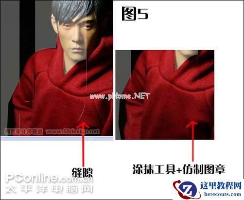 D:因为处理过图层混合模式的图层不能合并,所以做到这里,先将图片保存为JPG格式,然后用PS打开,只后用涂抹工具将两个图层之间的接缝部分涂抹掉,要配合仿制图章来制作。如图5。脸的部分方法同上。