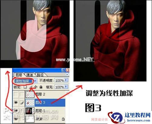 B:将抠出的图层混合模式修改为“线性加深”。如图3。