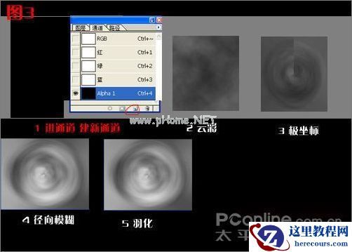 1、新建一个文件,大小随意,设置前后景色分别为白色和黑色;点通道面板,点最下方向的按钮,新建立一个ALPHA通道,此时画面变黑了;然后执行菜单—滤镜—云彩,随后执行扭曲—极坐标—平面坐标到极坐标,产生旋涡效果;为了追加旋涡效果,在加一次径向模糊,数值30;然后CTRL+T调整图像大小,使旋涡布满整个画布;然后执行选择—羽化 3像素。如图3。