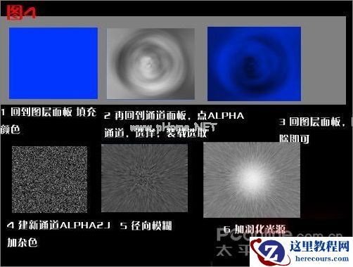 2、回到综合通道,设置前景色为R0 G54 B255,然后编辑—填充前景色;然后回到通道,点ALPHA通道,执行菜单—选择—装载选区,点OK,屏幕上会出现不规则的虚线,然后回到图层,点刚填充的蓝色图层,按下DELETE,删除,就得到了一个蓝色旋涡;然后再回到通道面板,新建一个通道ALPHA2,菜单—滤镜—杂色—添加杂色,90% 单色 高斯分布;执行菜单—滤镜—径向模糊,选择缩放,数量30,并调整其亮度;在放射颗粒的中间用原形工具拉出一个正圆,先羽化40像素,再填充白色;