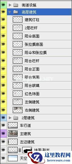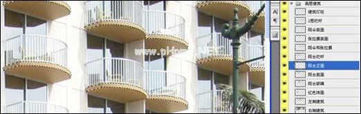 2、抠层需要把建筑看成BOX,我通常是把所有正面的墙面复制到一层里,把侧面复制到另一层,如果有底面,还要把所有的底面也复制到一层,图层的命名由自己喜欢。(个人观点:前期工作做细一点,后面会做得更顺手)