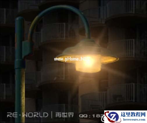 4、明度整体降下来了,我先把两个前面的路灯处理掉。方法很简单,我把灯泡和灯罩内部单独调亮,给了一个色温在3000K左右的光色,然后用画笔工具随意画了一个"米"字,然后调节亮度和颜色,高斯模糊,这样就成了从灯泡里发出的光线了。接下来,要处理灯杆。灯杆的右侧肯定会被灯光影响到,所以我做了一个很小的选区,羽化这个选区大概1到3左右,然后把选区放在应该会被灯光照到的位置,使用曲线工具,调节亮度。调好后,再调节色调。