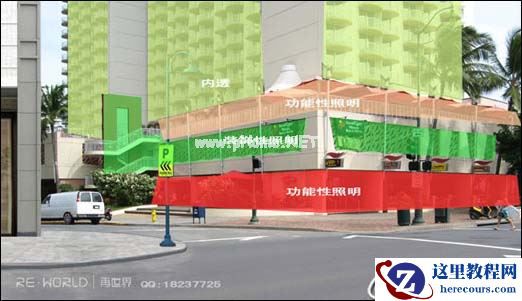 6、好了,继续,现在处理第一层商铺的功能性照明,我采用的是天花顶灯。这种灯有很好的照度,照出来的光比较均匀,光型也很好看。对于这种从上往下打的光,我采用的是PS里的光照效果滤镜。