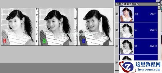 8、ctrl+i将蓝副本通道反相,反相后,原来白的变黑,黑的变白了。但由于原来白的部分不是纯白,当然反相后就不可能是纯黑了,为了将黑度增强,就必须要进行下一步的色阶调整了。