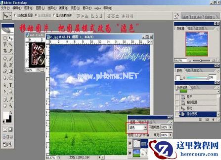 2、移动图片至想要的背景图片上,把所在层的模式改为“滤色”。