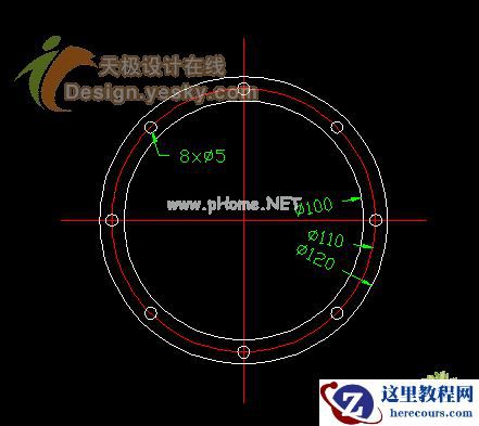 如图,这是一个按照零件原尺寸绘制的外径120MM的法兰,而为了得到一个外径125MM的法兰草图,难道一定要另外绘制一个新圆?没有必要!我们只需要使用文字替代的办法修改一下标注就可以解决这个问题了。