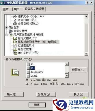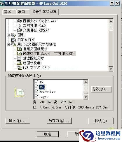 在“打印机配置编辑器”对话框中选择“设备和文档设置”选项卡,选择“用户定义图纸尺寸和校准”中选择“修改标准图纸尺寸(可打印区域)”选项。在“修改标准图纸尺寸(Z)”下拉列表中选择“A4”,如图5所示。