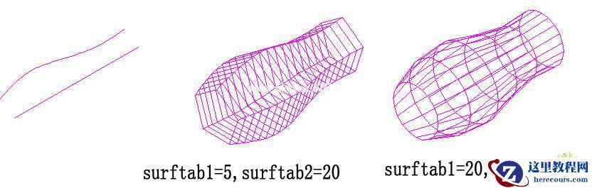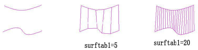 沿表面母线方向网格线由SURFTAB1分段,而沿拉伸矢量方向的分段数是SURFTAB2。如下图一: