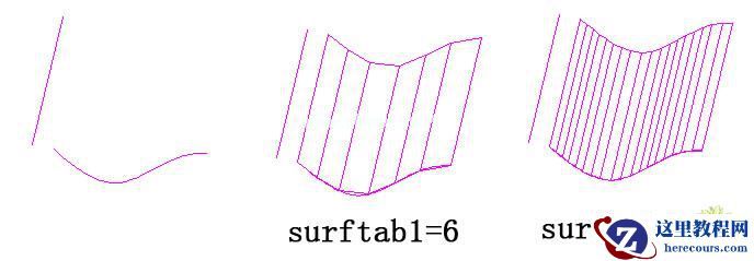 直纹面的两条边界间均匀分布网格线,等分数由系统变量SURFTAB1决定,如下图三: