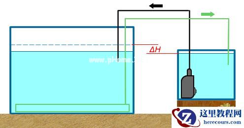 主缸布置DIY底滤,小缸用于进一步过滤,相当于测滤+外滤。为避免振动等对主缸生物的影响,水泵置于滤缸,用以制造水位差 ΔH 而形成虹吸,使主缸被动出水。