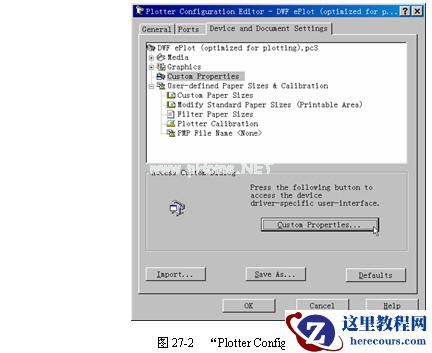 在创建DWF文件时,用户可以在ePlot打印配置文件中设置DWF文件的特性。在图27-1中,选择“DWF ePlot(optimized for plotting).pc3”项后可单击PropertIEs..按钮,弹出“Plotter Configuration Editor(打印机配置编辑器)”对话框,如图27-2所示。