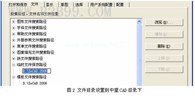 如果是设计人员,文件目录最好是设置到中望CAD目录下,便于查找,如图2所示。当然,也可放到你认为方便的地方,中望CAD是将图、外部引用、块和临时文件放到“我的文档”中,一般来说,“我的文档”中有各种各样的文件,如果你的机器上的“我的文档”中文件太多,建议就要修改上述几种文件的用户路径。