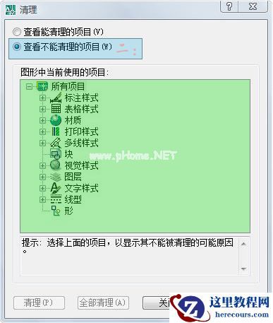 列出不能从图形中删除的命名对象。 这些对象的大部分在图形中当前使用,或为不能删除的默认项目。 当选择单个命名对象时,树状视图下方将显示不能清理该项目的原因。