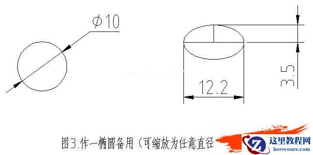 1、 先绘一Φ10圆的椭圆(见图3),此后绘图中可缩放成不同直径的圆的椭圆。很方便的技巧哟!此后绘图中,需要用到椭圆时,请复制第一步中的椭圆进行缩放和旋转。