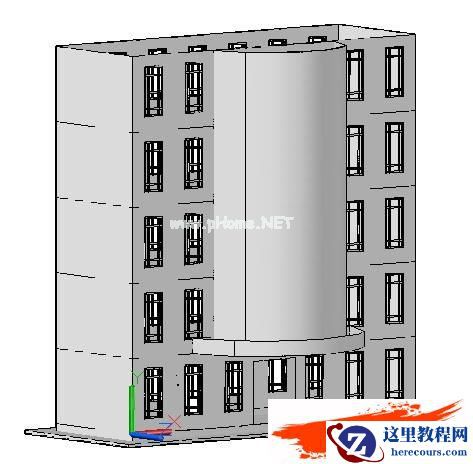 5、创建弧形外墙:在二层层高处的平面,绘制一曲线(可封闭也可不封闭),然后用“曲面拉伸”工具拉伸至屋顶,以创建出半筒体曲面,供作玻璃幕墙用,详图-5。
