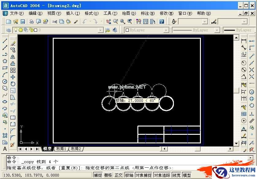 选中4个圆,然后点击工具栏上的复制图标,以圆心为复制的基点(图4),待极轴追踪线旁边显示出“极轴:27.0000 < 60°”的字样时(这里27.0000是圆的直径,60°即极轴追踪角度),按下鼠标左键即可画出这4个圆,接下来按照类似的办法即可依次画出上面的3个圆、2个圆和1个圆。