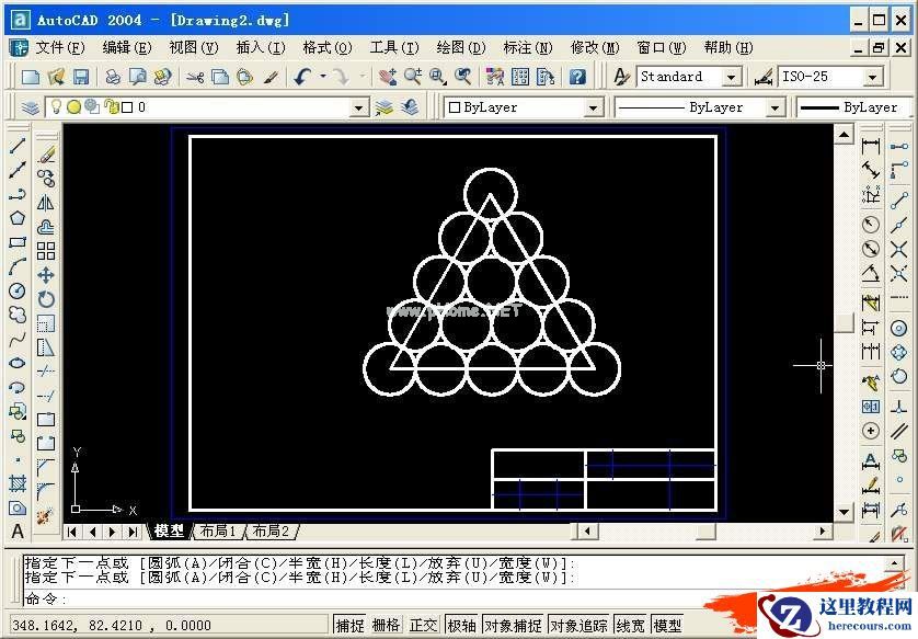 在一次AutoCAD竞赛中,一道题难住了不少人,题目的要求是建立一个边长为150的正三角形,并在正三角形中绘制15个圆,其中每个圆的半径相等,各个圆与三角形各边之间两两相切(图1)。