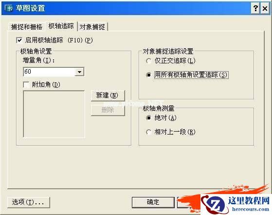 单击“工具→草图设置”,进入“草图设置”对话框,切换到“极轴追踪”选项卡,在这里设置极轴的增量角。由于是一个正三角形,因此“增量角”应该设置为60°(图3),并选中“用所有极轴角设置追踪”项;接着切换到“捕捉和栅格”选项卡,勾选“启用捕捉”复选框和“极轴捕捉”单选框。极轴距离指圆的直径值。