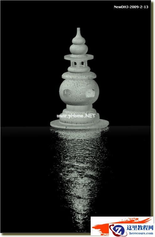 6、添上背景图渲染的效果。其中的面域对后面的(香炉脚图形水下部分)图形有遮挡作用;对前面图形有镜像图,但经过凹凸贴图的图形变形了:对背景图却透明,与背景图溶入为一体