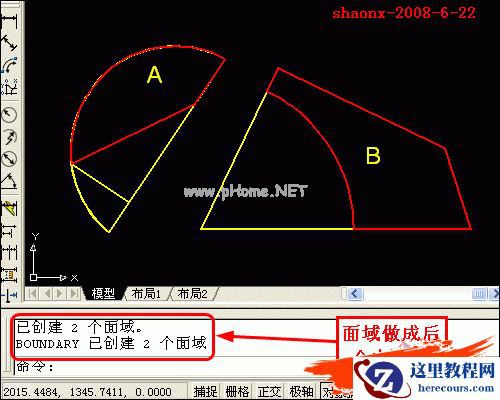 4、在图形界面里点击A、B的内部后,所做成的面域与当前图层的颜色一致,同时,在命令行里也会出现已经做成面域的提示。