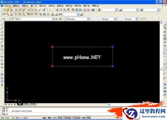 使用鼠标选择该矩形,在默认设置的情况下,矩形的四个夹点就在屏幕上以蓝色方块显示,使用Shift键加鼠标点击的方法依次点击我们想要拉伸的两个夹点,被激活的夹点在屏幕上以红色方块显示(如图)。