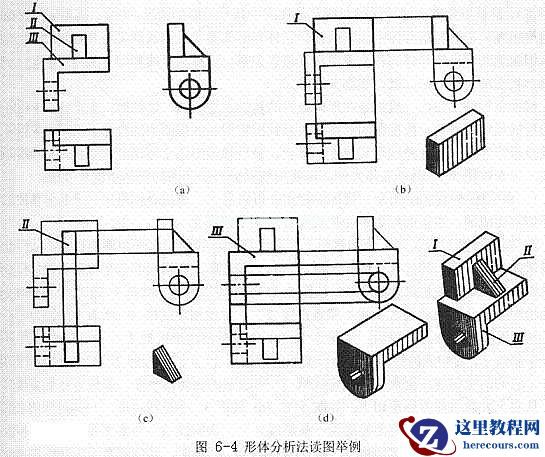 1)按线框、分部分、找投影。图6—4(a) 所示,先在主视图中按封闭线框I、II、Ⅲ将它划分为三个部分,然后,根据各视图间的投影关系并借助三角板、分规等,分别找出各部分在俯、左视图中相应的投影,如图6—4(b)、(c)、 (d)、所示三视图中用粗实线画出的线框,即各个部分的三视图。