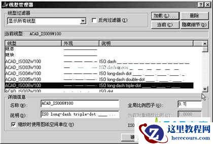 先来看看“全局比例因子”的设置。“全局比例因子”LTSCALE控制着所有线型的比例因子,通常值越小,每个绘图单位中画出的重复图案就越多。在缺省情况下,AutoCAD 的全局线型缩放比例为 1.0,该比例等于一个绘图单位。在“线型管理器”中 “详细信息”下,可以直接输入“全局比例因子”的数值(如图所示),也可以在命令行中键入ltscale命令进行设置: