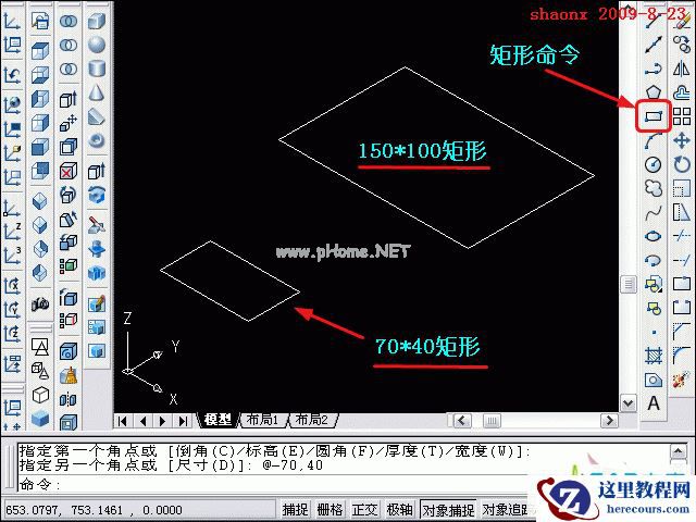 2、在三维界面里,点击“矩形”命令,画一个150*100的矩形和一个70*40的矩形,如下图: