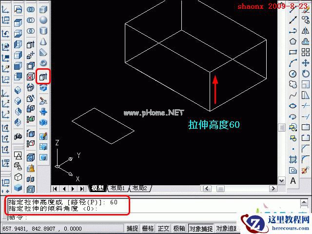 3、接着进行“拉伸”,先拉伸大的矩形,拉升高度为60,倾斜度为0。