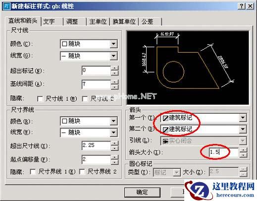 对于建筑图,只需修改箭头为建筑标记,同时将箭头大小的值改小一些。此处的值为斜线的水平投影长度,国标要求斜线长2~3mm。