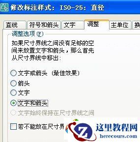 3、通过选择调整选项中的文字和箭头,可以使直径标注的数字在圆中位置时仍能出现两个箭头