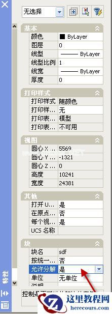 3.在特性窗口中,“块”选项下,选择允许分解>>“是”;