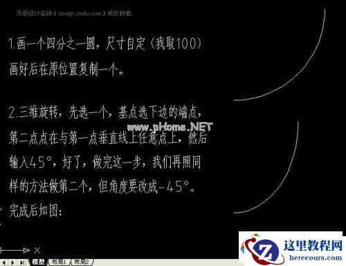 一、先在AutoCAD中画一个四分之一圆,尺寸自定(我取100)画好后在原位置复制一个。