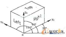 正等轴测图的三个轴测轴X1、Y1、Z1与通用坐标系(WCS)x轴的夹角分别是30°、150°和90°。一个实体的轴测投影只有三个可见平面,这三个面是进行画线、找点等绘图操作的基准平面,将平行于Y1OZ1、X1OZ1、X1OY1平面的分别称为左(融)、右(Right)和上(Top)正等轴测平面,见图2。