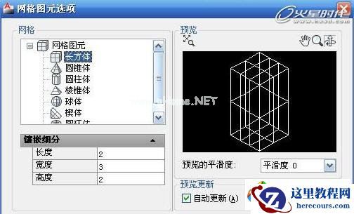 首先,在“网格”面板的“图元”中设置长方形的网格数,设置网格长、宽、高为:2、3、2,即可满足双人沙发的建模了。(图01)